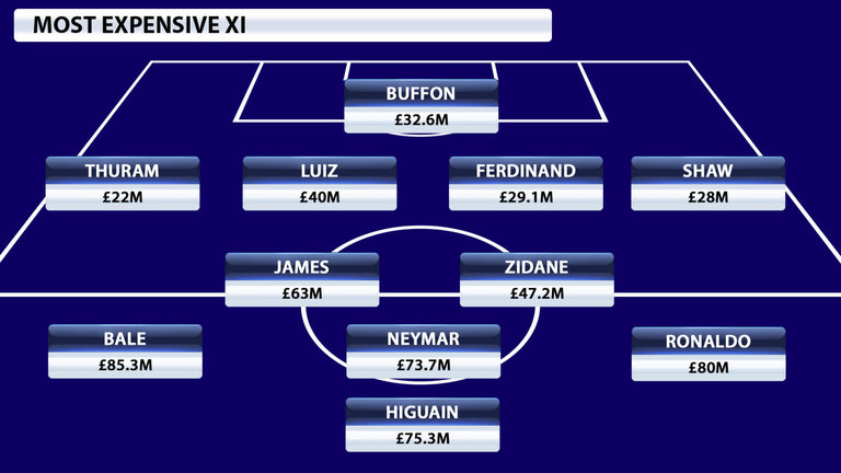 Sky Sports a alcătuit un “11” format din cei mai scumpi jucători de pe fiecare post. Lângă Gianluigi Buffon, Zinedine Zidane sau Cristiano Ronaldo și-a făcut loc și Luke Shaw, cel mai scump fundaș stânga din istorie. Manchester United a plătit anul trecut 35 de milioane de euro pentru transferul englezului de la Southampton. Formația alcătuită de Sky Sports, care valorează 700 de milioane de euro, are următoarea componență:  Gianluigi Buffon – Liliam Thuram, David Luiz, Rio Ferdinand, Luke Shaw, James Rodriguez, Zinedine Zidane, Gareth Bale, Neymar, Cristiano Ronaldo, Gonzalo Higuian. Juventus Torino a plătit 90 milioane euro pentru transferul atacantul argentinian Gonzalo Higuain. Astfel, Higuain devine cel mai scump atacant din lume. Doar Cristiano Ronaldo și Gareth Bale au fost mai scumpi decat vârful argentinian în vârstă de 28 de ani. Transferul atacantului central argentinian, care a realizat un sezon excepţional cu Napoli, pe care a dus-o pe locul 2 în Serie A înscriind 36 de goluri în 35 de meciuri de campionat, i-a permis în acelaşi timp lui Napoli să încaseze 90 de milioane euro, o indemnizaţie de transfer fără precedent în Italia. Este a treia cea mai scumpă indemnizaţie de transfer din istorie, după cele plătite de Real Madrid pentru a-şi asigura serviciile lui Gareth Bale în 2013 (101 milioane euro pentru Tottenham) şi ale lui Cristiano Ronaldo (94 milioane euro pentru Manchester United) în 2009.